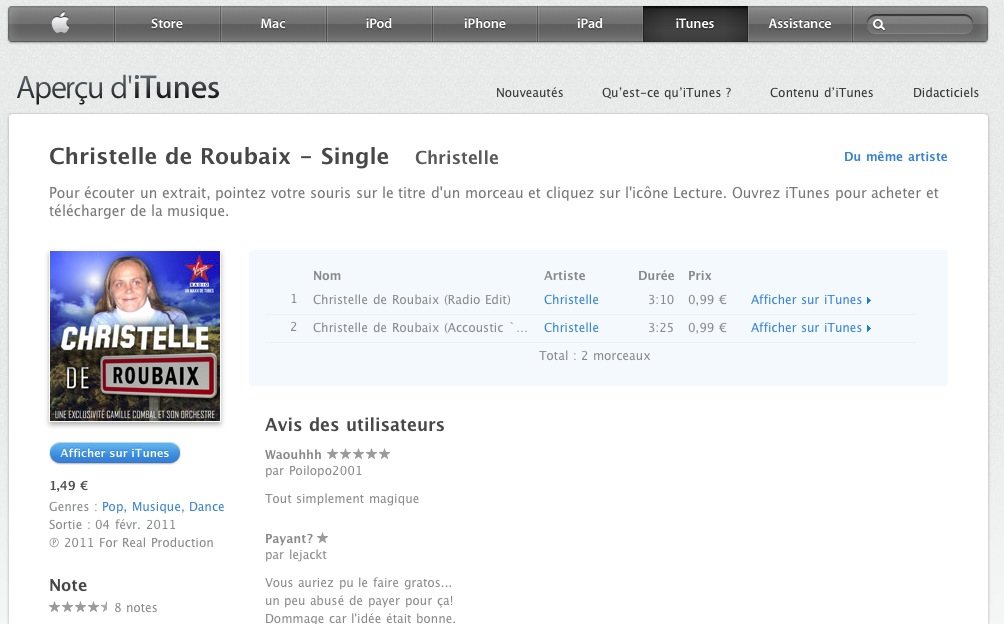 Depuis ce vendredi, les internautes peuvent acheter les deux morceaux, à 1,49€ le single estampillé Virgin Radio, sur iTunes, et il y a de quoi être profondément choqué : c’est non seulement l’identité d’une personne, son accent, et son image, qui sont marchandés, sans doute pour pousser la plaisanterie encore un peu plus loin, mais aussi, quelque part, une atteinte assez discutable envers l’image de la ville de Roubaix, et ses habitants, citée nominalement dans le titre. Reste à souhaiter encore une fois à Christelle et à sa famille de s’en amuser au mieux !
