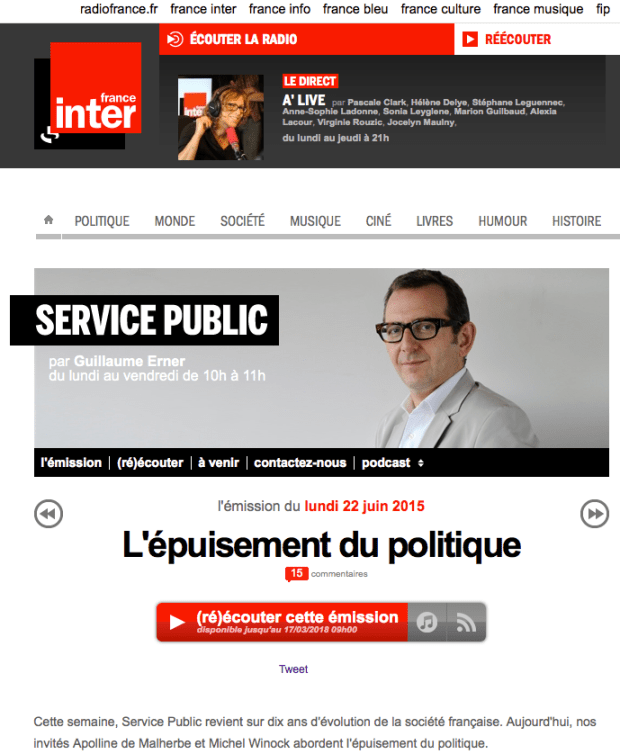 France Inter : « L’épuisement du politique » (Service Public, Guillaume Erner)