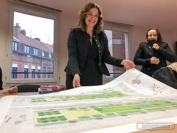 Avec la présence des élus municipaux Max-André Pick, adjoint à l’urbanisme et de Jean Deroi, maire-adjoint des quartiers Nord, rejoints par Karima Zouggagh, délégué aux marchés publics, Marie-Agnes Leman, déléguée à la démocratie participative, Ghislaine Wanderberq, déléguée à la vie associative, puis plus tard, par Philippe Duquesne, délégué à la politique de la Ville — l’opposition était présente par Marjolaine Pierrat-Ferraille, la paysagiste Mia Hallinger a défendu les deux projets à la suite, le premier autour d’une péniche maintenue accueillant des bancs, l’autre sans.