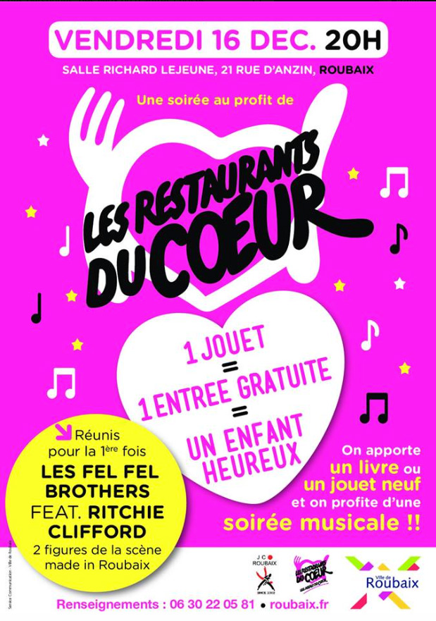 Ce vendredi 16 décembre 2016, de 20h00 à minuit se tient une soirée au profit des Restos du Coeur. Le principe : pas d’entrée à payer, il suffit d’amener un livre ou un jouet neuf et de profiter des concerts. Et l’affiche réunit pour la premiere fois, les mythiques Fel Fel Brothers et Ritchie Clifford, artistes roubaisiens par excellence.