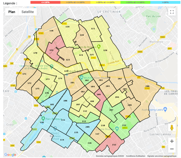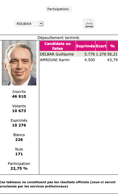 La mauvaise surprise est encore une fois l’abstention qui, mandat après mandat, structure désormais toute élection, les municipales, élections jadis les plus participatives. Si, en national, on est « remonté » à 60% d’abstention, en local, à Roubaix on en est à 77% d’abstention. Dans certains quartiers, ca monte même jusque 88% d’abstention (source). C’est juste sidérant.