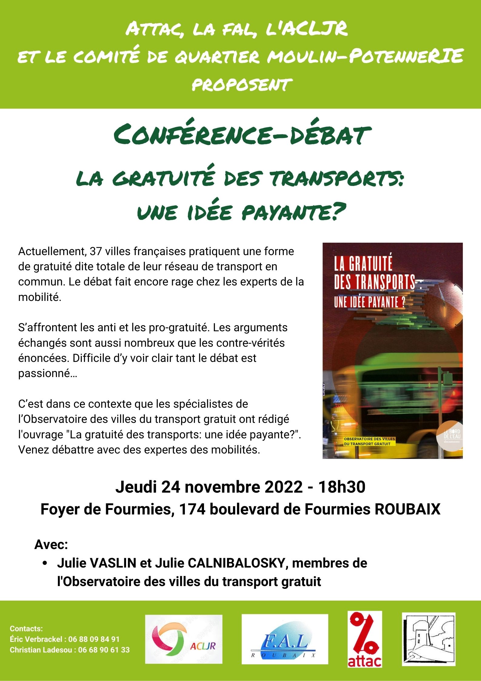 Pour aller plus loin dans le débat, le collectif organise ce jeudi 24 novembre à 18h30 au foyer Fourmies, 174 boulevard de Fourmies à Roubaix, une conférence à laquelle sont invitées Julie Vaslin et Julie Calnibalosky, membres de l‘observatoire des villes du transport gratuit à l’initiative du live, « La gratuité des transport une idée payante ? ».