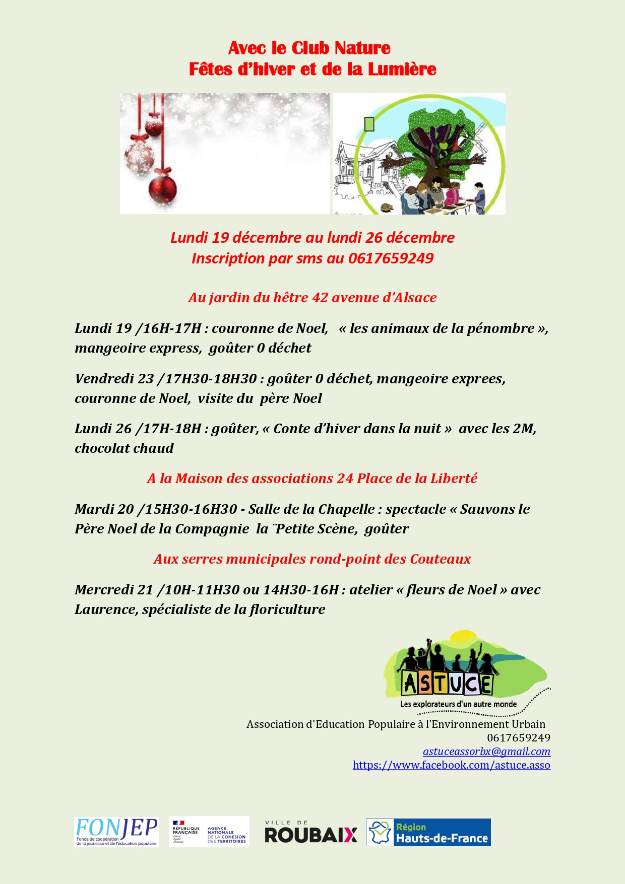Nous y étions pour découvrir ce moment convivial et créatif coanimé par Isabelle Bras, coordinatrice de l’association ASTUCE et Laurence Mathys, floricultrice aux serres municipales de Roubaix. Cet atelier était réalisé dans le cadre d’une semaine d’animations organisée par ASTUCE pour fêter le solstice d’hivers. Les activités se poursuivent jusqu’à ce lundi 26 décembre par un goûter, « Conte d’hivers dans la nuit », au jardin du Hêtre à Roubaix.