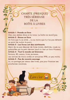 Mais attention ! On ne dépose pas n’importe quoi dans la boîte à livres ! Le comité de quartier a rédigé une charte pour assurer le bon fonctionnement de cette boîte à livres et la garder dans un bon état !